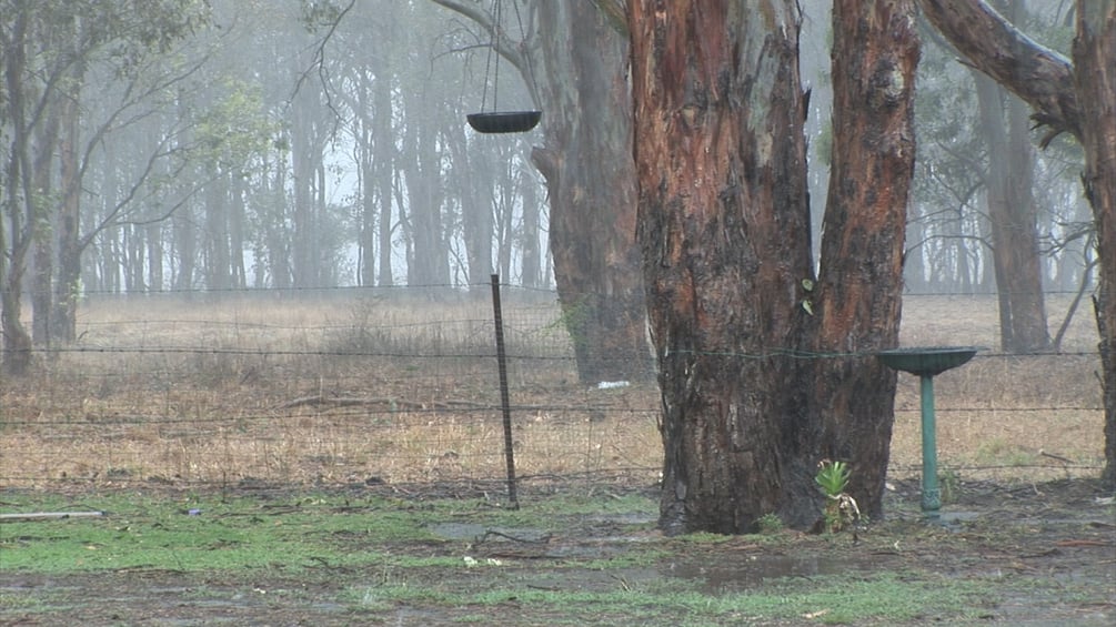 Stock Video Raining on Gumtrees with Birdbath